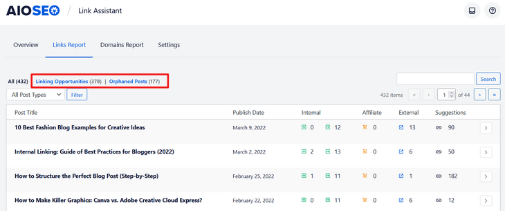 AIOSEO to takođe čini lakim. Pomoćnik za veze će popisati sve stranice vašeg sajta i automatski generisati izveštaj o vezama kojem možete pristupiti klikom na Link Assistant u All in One SEO meniju.