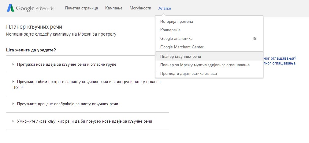 Prvi i najvažniji savet je mudro izabrati kljucne reci. Postoji par alata koji ce vam u tome pomoci. Imajuci u vidu da nam je cilj dobar rang u google pretrazi, prvi alat ce vam biti Google Adwords Keywords Tool. Da biste ga mogli koristiti orate posedovati Google nalog ili obican Gmail. Ako nemate Adwords nalog, sa tim podacima otvorite sebi jedan i u okviru njega koristite ovaj alat.