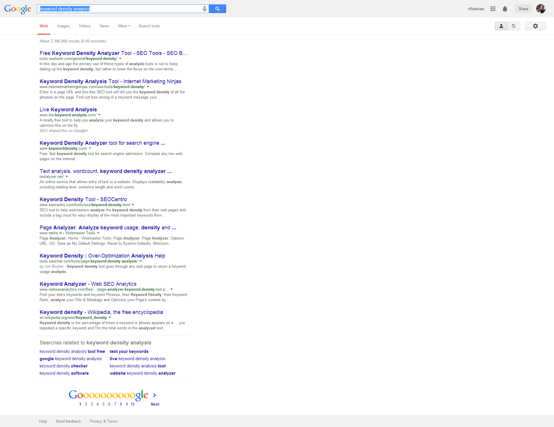 Sledeći korak je napraviti listu top sajtova koje vam pretrazivac daje kao rezultat za svaku kljucnu rec. Ako ovo deluje kao mukotrpan i dosadan posao, to je zato sto jeste, jer ako imate 20 kljucnih reci, pa to pomnozite sa 5 rezultata za svaku rec, dobili ste 100 sajtova koji su vaša ljuta konkurencija. U realnom slucaju lista ce biti manja iz razloga što će se neki sajtovi ponavljati više puta za različite ključne reči, ali bez obzira na to, pretraživač će kao rezultate najverovatnije izbacivati različite stranice tih sajtova.